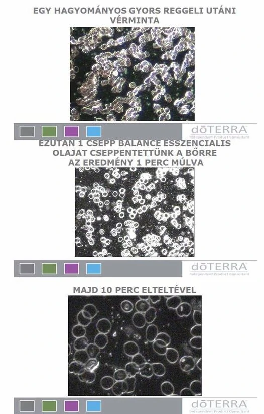Az első képen egy hagyományos reggeli utáni vérminta látható. Ezután lett bekenve az illető talpa, doTerra Balance eszenciális illóolajjal. A második képen a bekenés után 1 percel vett vérminta látható, majd a harmadik képen a bekenés után 10 percel vett vérminta. 10 percel az illóolaj használata után, a vörös vértestek teljesen különváltak egymástól.